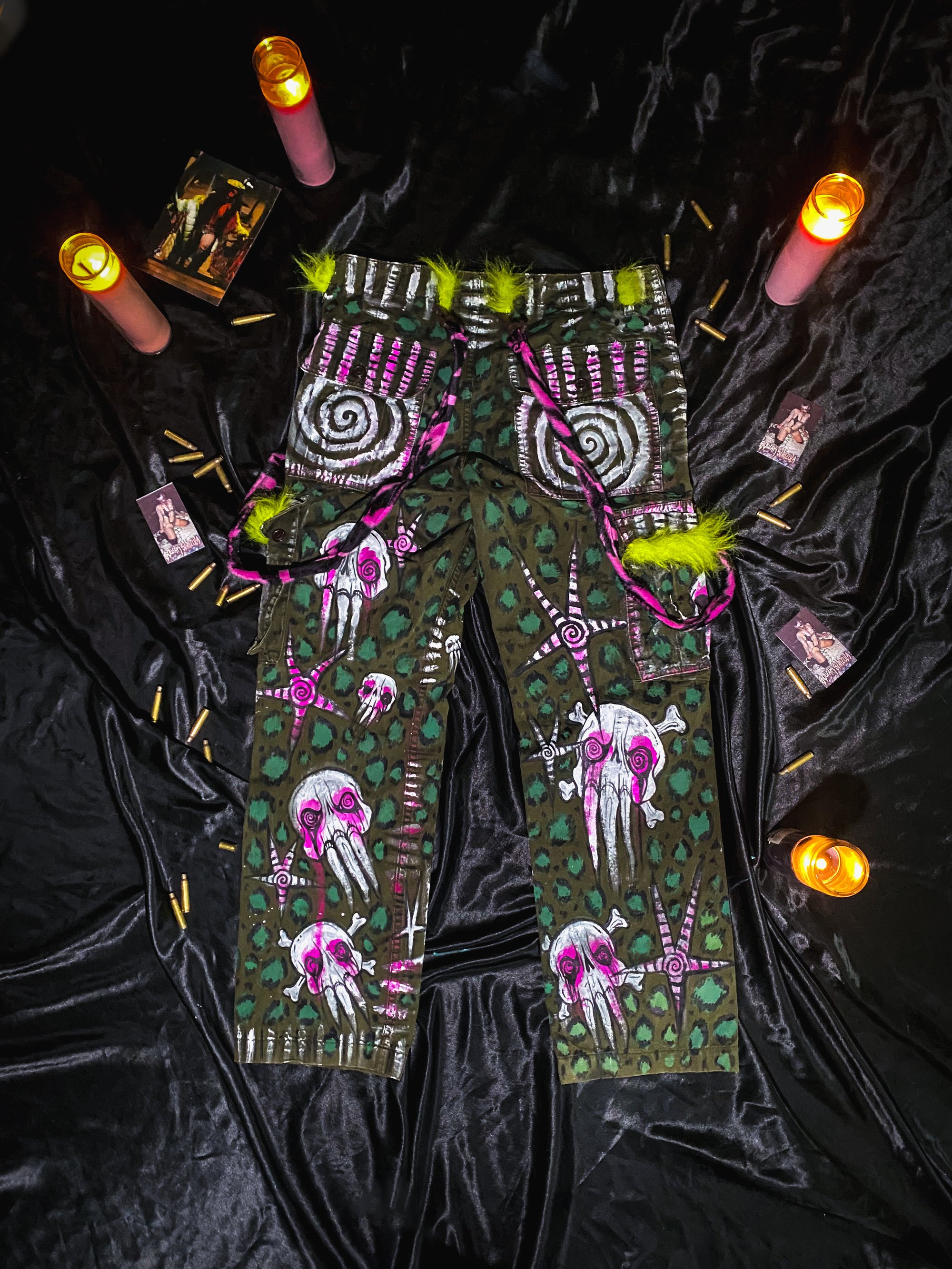 Hand painted upcycled green cargo pants with custom made zebra print detachable straps and faux fur lined side pockets.
